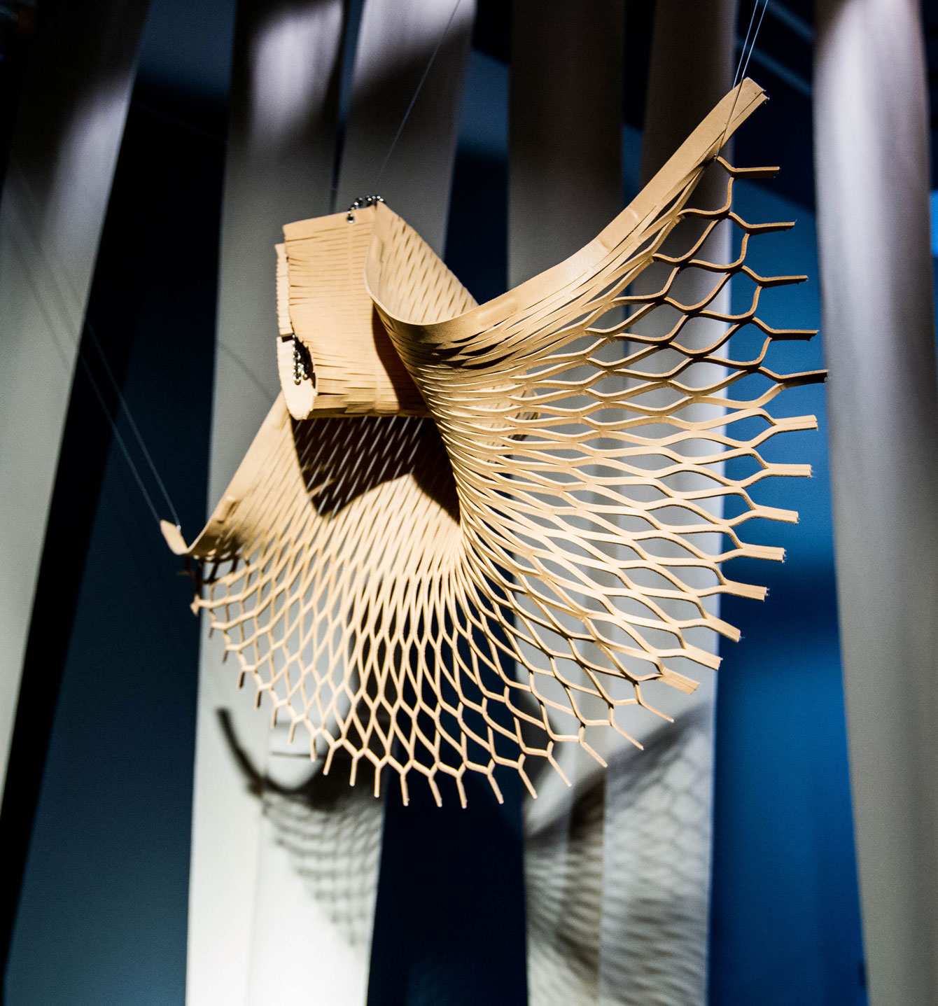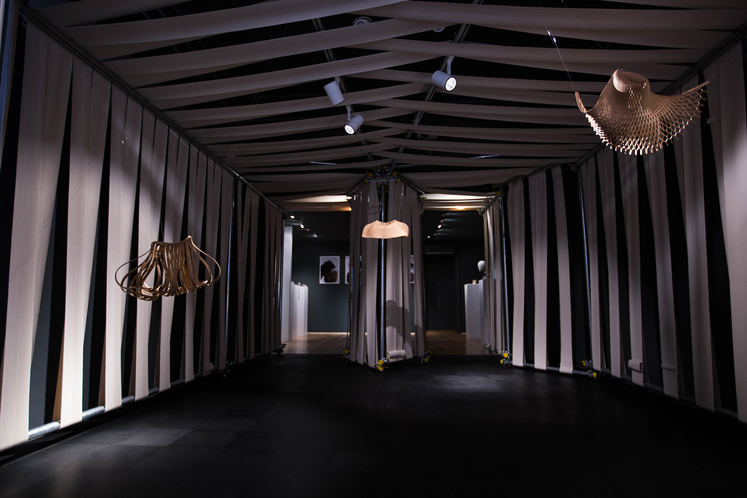 A structure was designed and built in scaffolding inside the first space, which was then fully wrapped with a white cotton ligament we found from a hospital supply manufacturer outlet. This wrapping effect produced lines and voids which mimicked her pieces which are very architectural per se. This space was the gallery/exhibition space where we hung her main pieces with nylon cords as if they’d be floating.