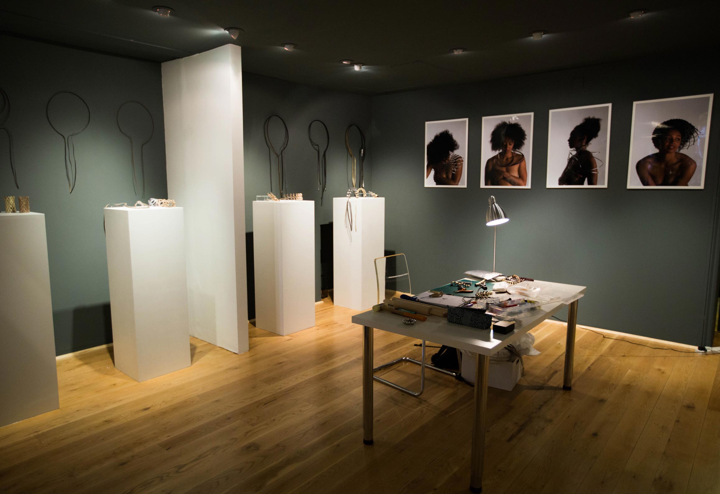 The first challenge was that albeit being in a very well frequented commercial street, the shop was enormous for her to showcase her hand made jewellery. We talked her out of cladding the walls with mirrors which would only make it larger and instead we split up the room into two areas: the gallery/exhibition space and the workshop/proper shop where she could sell her items. We fixed the envelope of the shop and painted the walls in a very dark grey and cladded the floor in black vinyl which could then be reused further on for a different project.