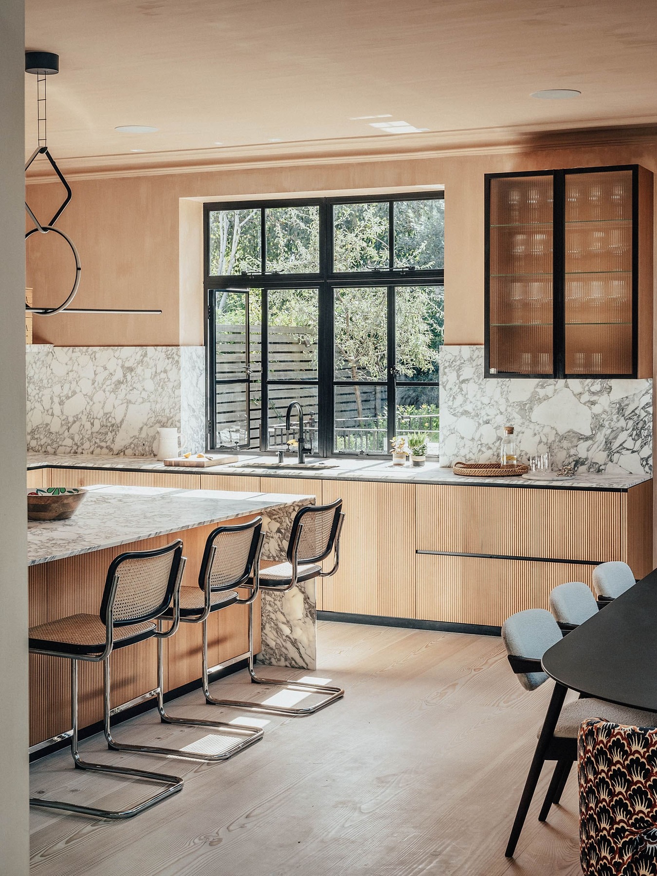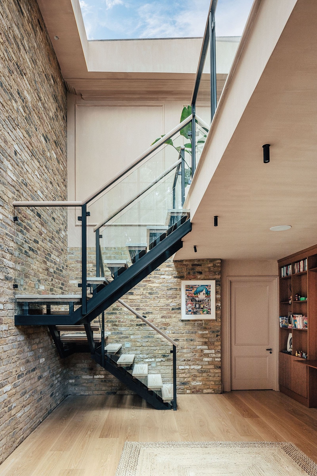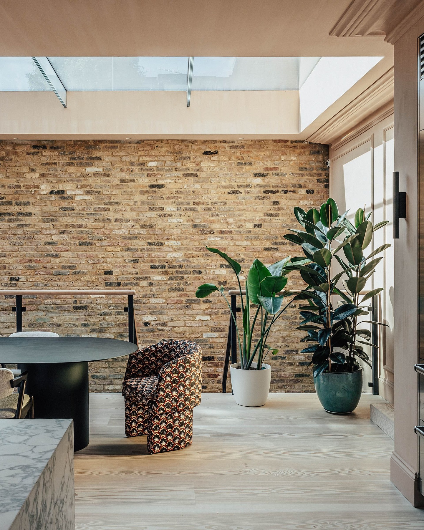 Arabescato marble introduces tactile richness in the kitchen, while an exposed brick wall was preserved to honour the building’s original fabric. Even the glass blocks, once concealed in a wall, were salvaged and reimagined as the bar for the garden pavilion.