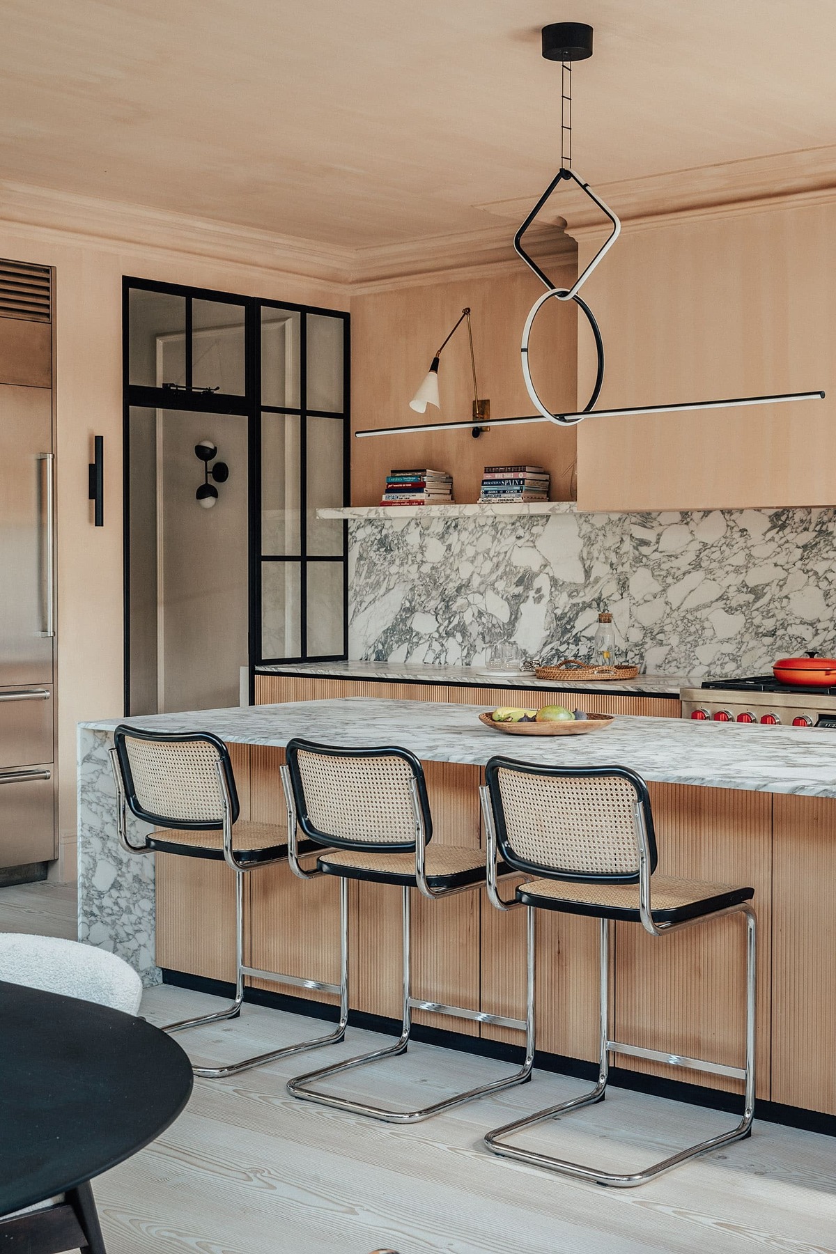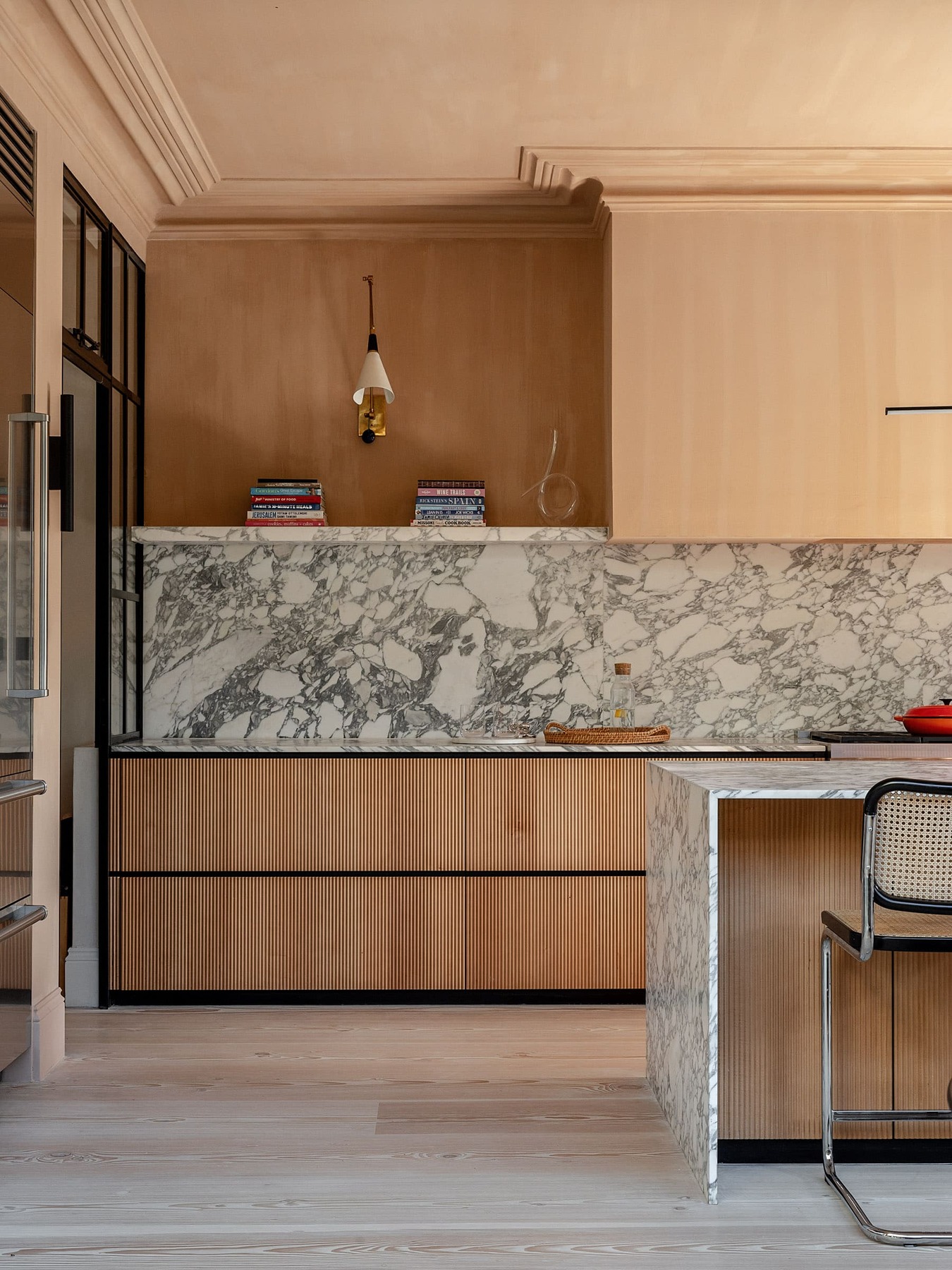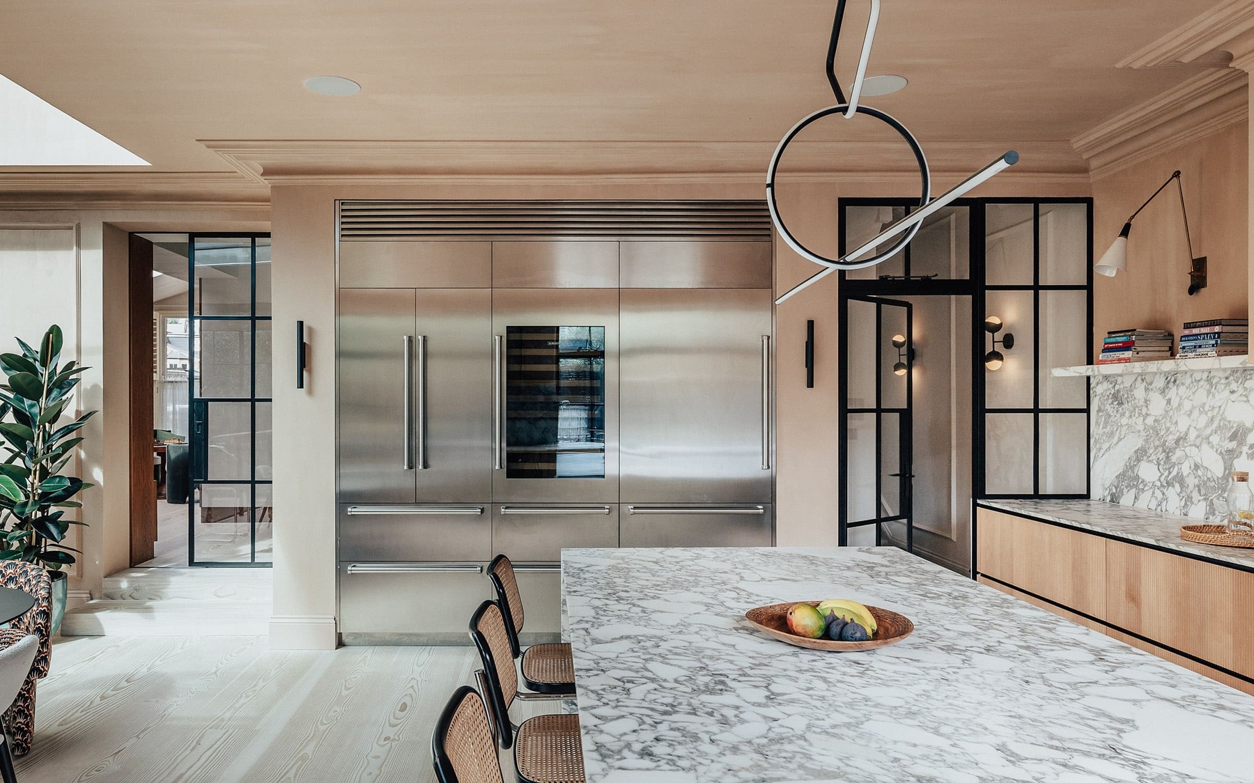 Arabescato marble introduces tactile richness in the kitchen, while an exposed brick wall was preserved to honour the building’s original fabric. Even the glass blocks, once concealed in a wall, were salvaged and reimagined as the bar for the garden pavilion.
