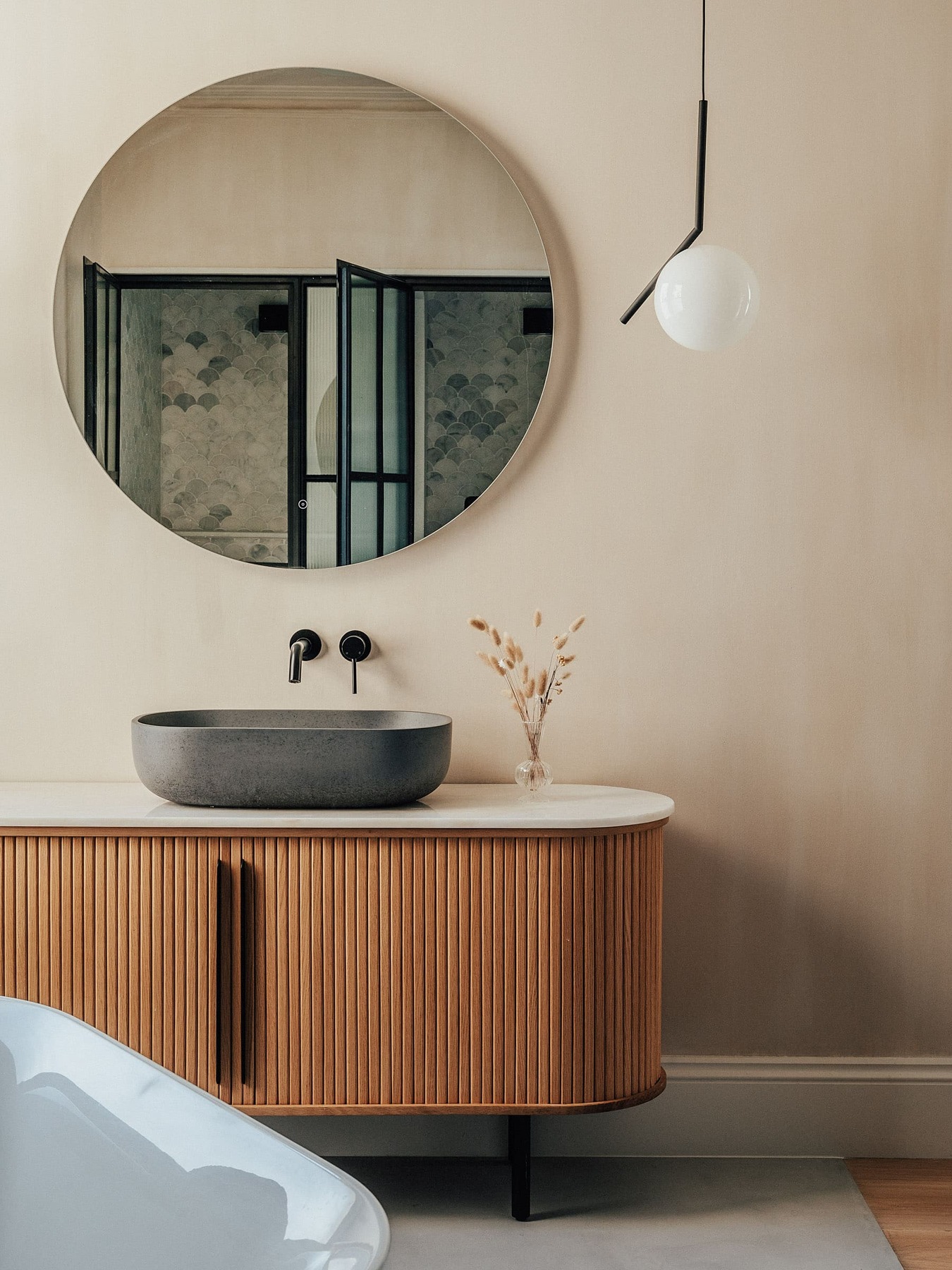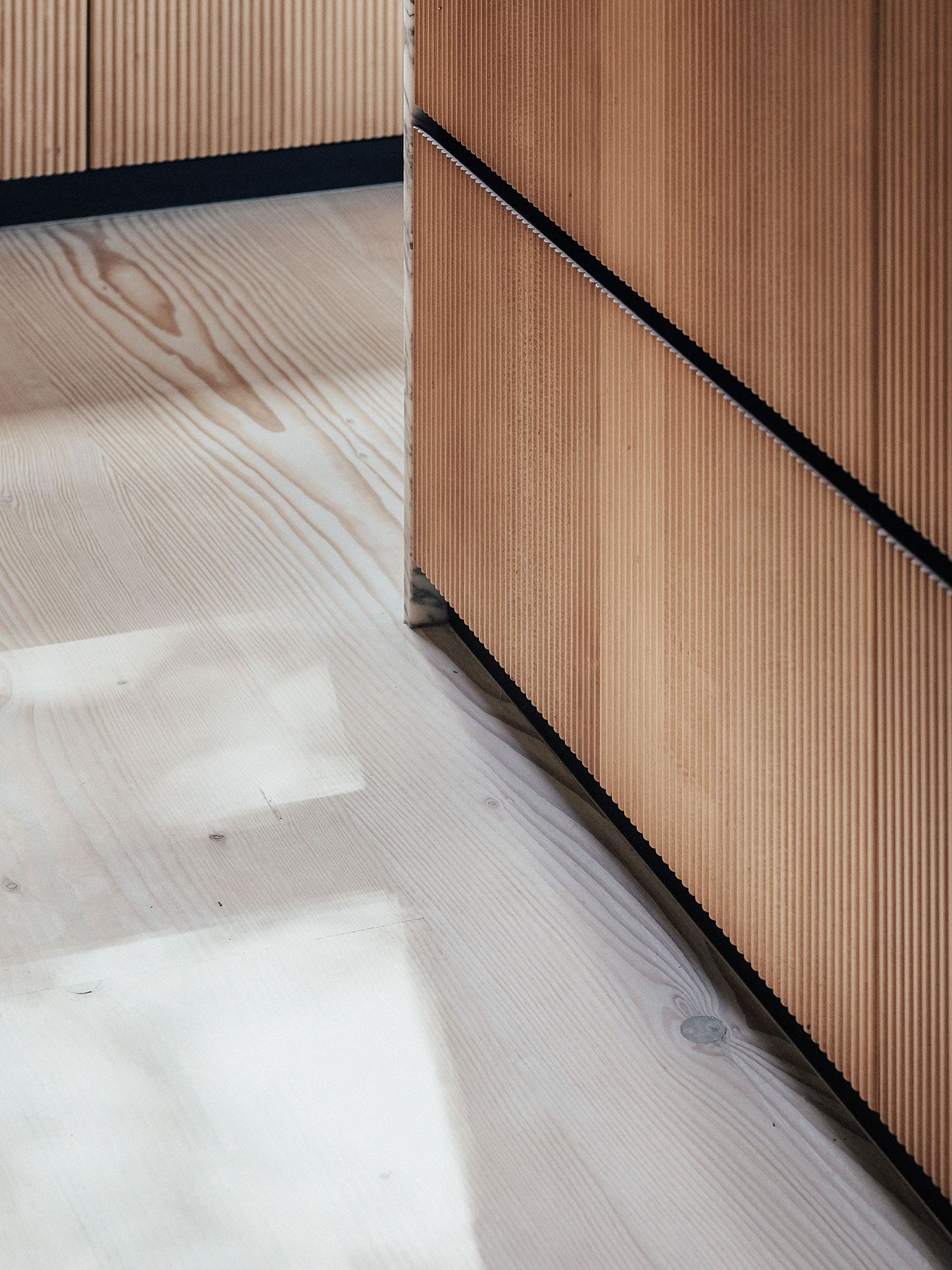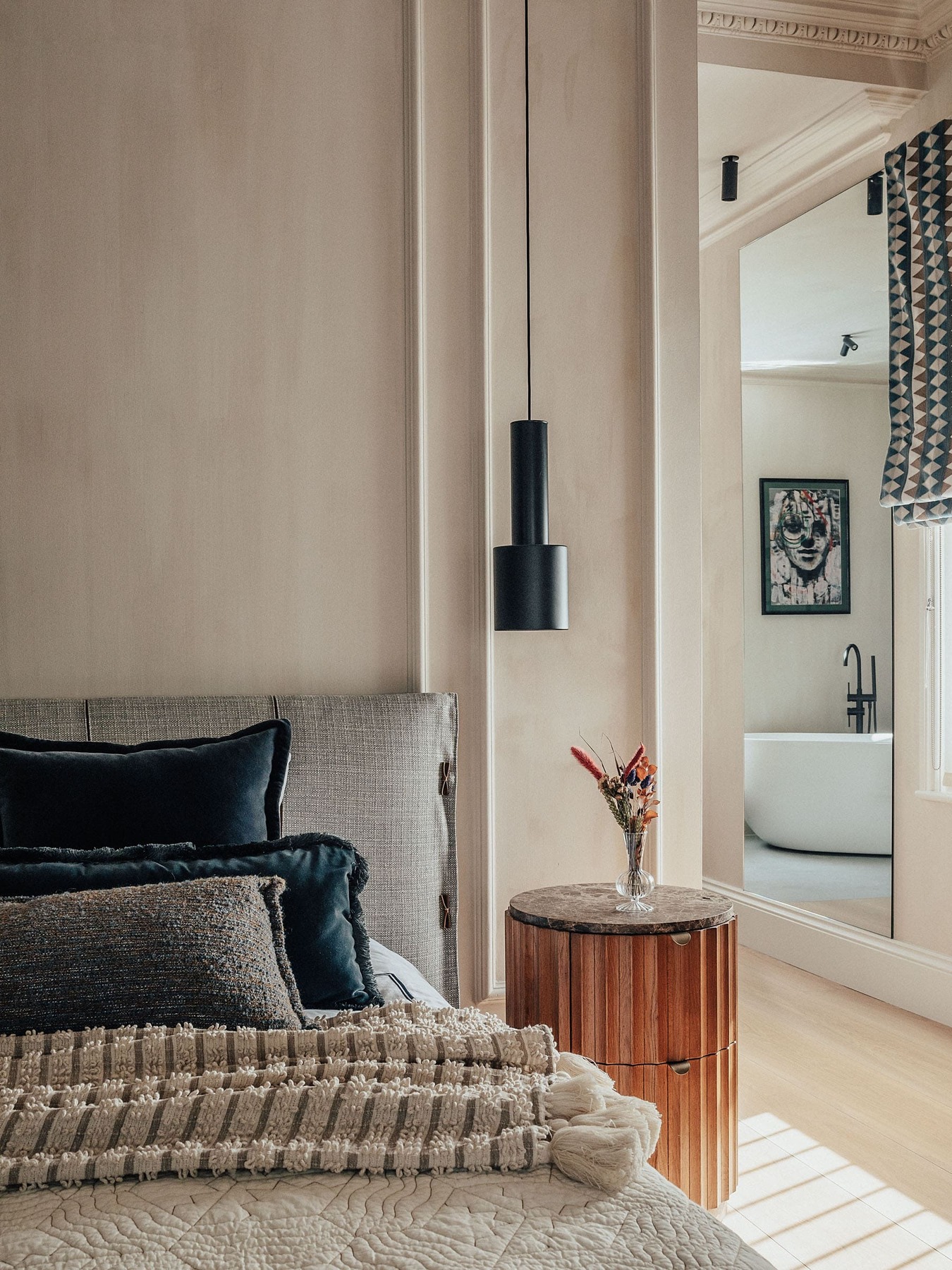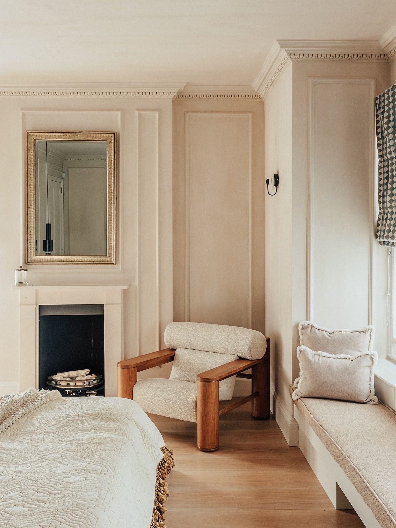 To preserve the house’s Victorian character, mouldings were reinstated across walls and ceilings, re-establishing a sense of proportion and detail. A restrained palette of noble, low-toxin materials further underpins the project: limewash paint lends depth and softness to the walls; Douglas fir flooring runs throughout; and bespoke oak joinery — both brushed and ribbed — articulates storage and thresholds.