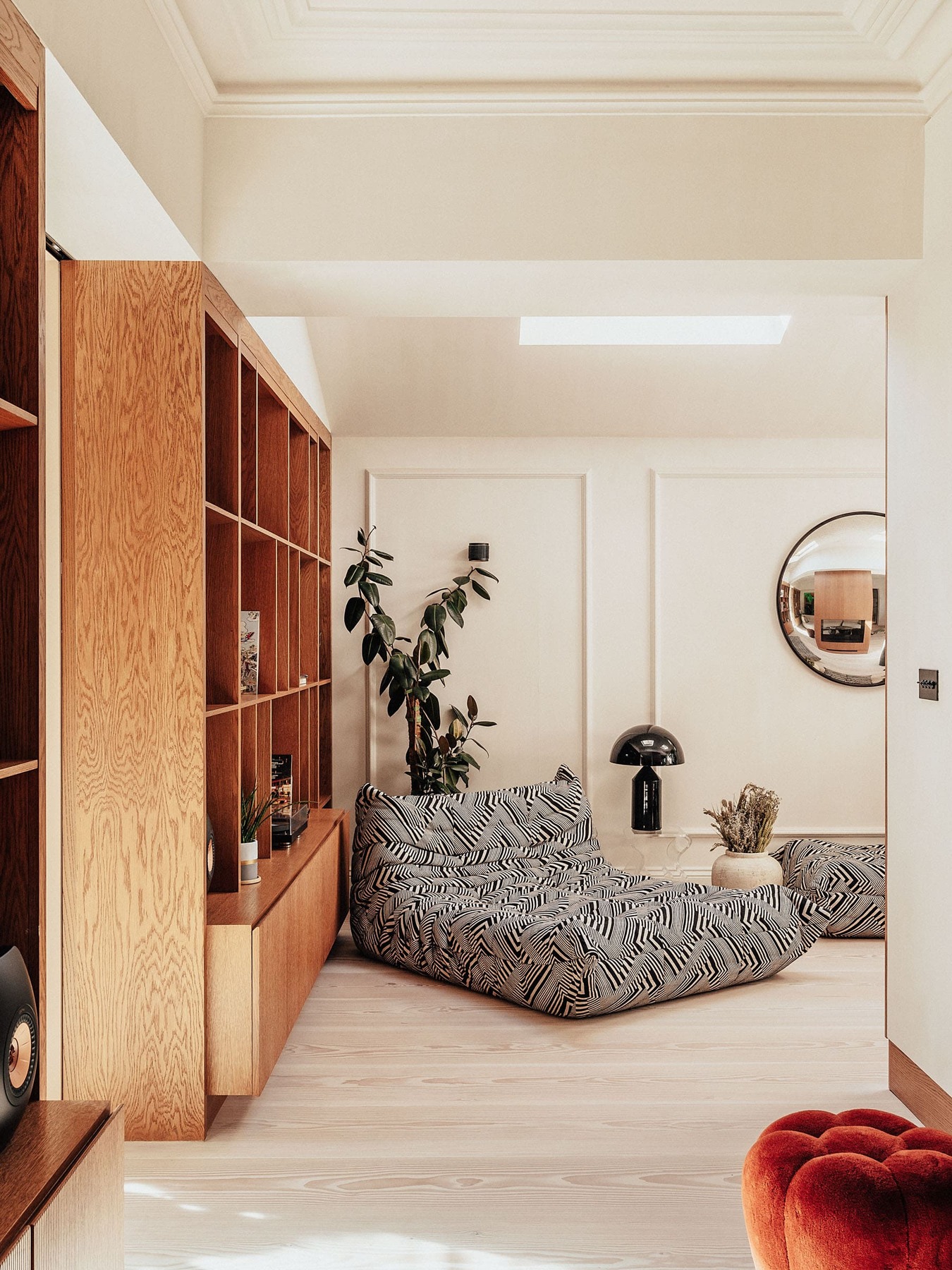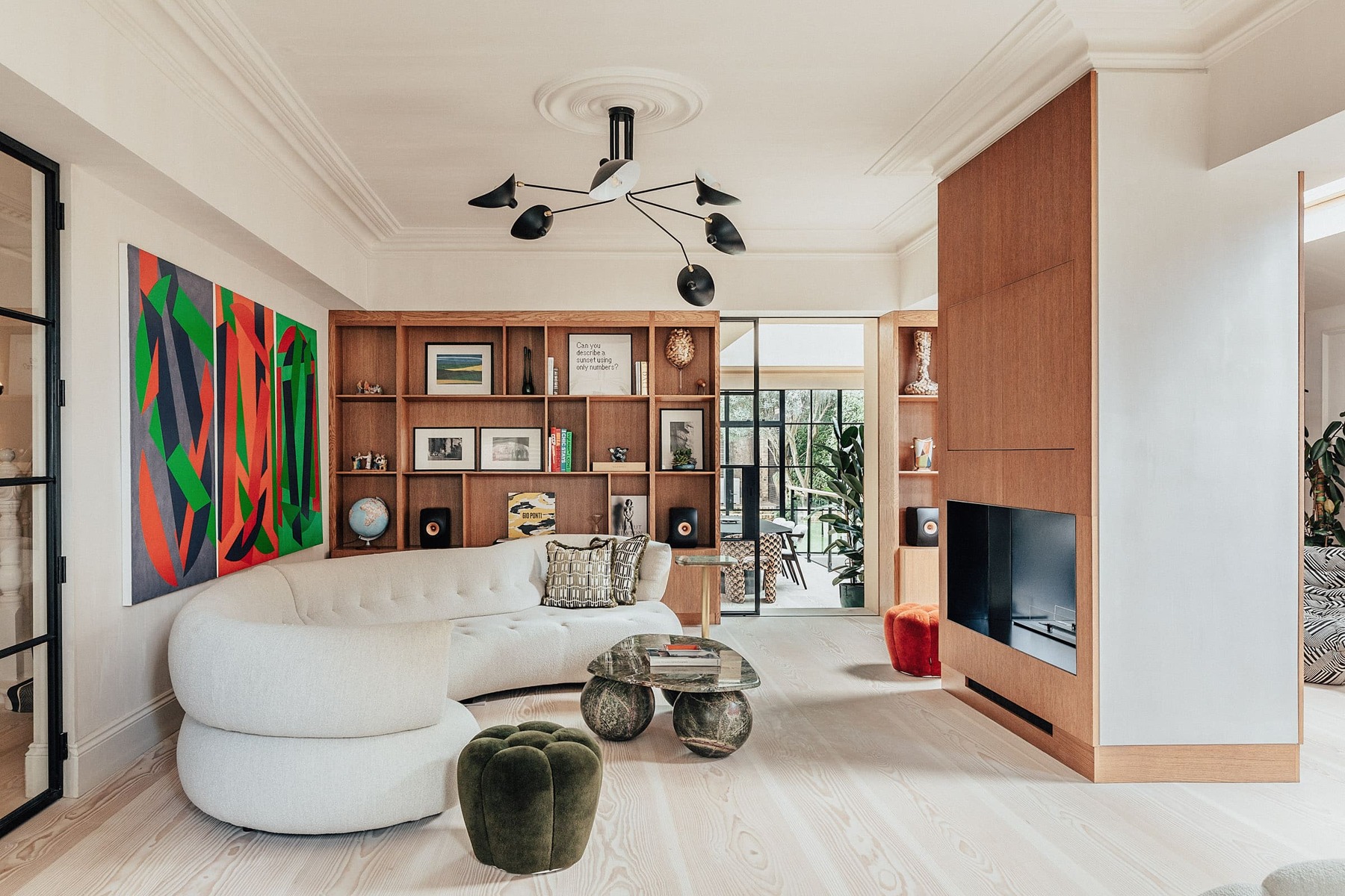 On the ground floor, the former study was absorbed into the living room, removing load-bearing walls to open the plan and allow west-facing sunlight to penetrate deep into the space through skylights. This transformation dramatically altered the character of the house, expanding the living room from 4 metres to 7.5 metres wide. A new fireplace, designed from scratch as a focal element, anchors the room, while circulation and light now flows seamlessly between kitchen, dining, and living areas.