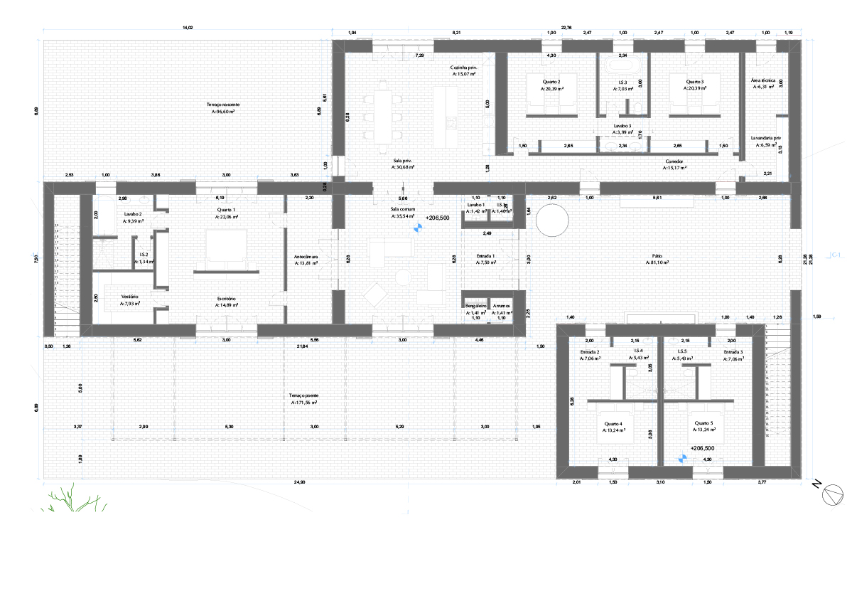 The planning application or, projeto de licenciamento, consists of a set of drawings and written elements that enable a good understanding of the proposal in order to submit to the municipality seeking approval for construction. It also includes the terms and declarations required for the various licenses and includes the follow up with the relevant municipality on the progress of the processes. Before submitting the planning application, architecture couples with the engineering team to create the specialty projects so the project goes through every engineering department before being submitted. This way we know that when we produce the detailed drawings on the next stage, these projects have been preapproved by the engineering team. This is a general project designed at a larger scale.